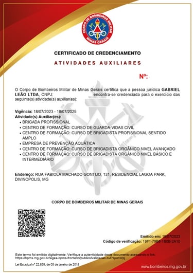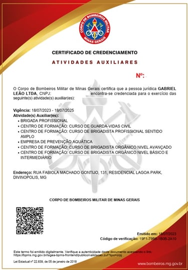Nosso Centro de Treinamento e nossos instrutores são credenciados junto ao Corpo de Bombeiros MG